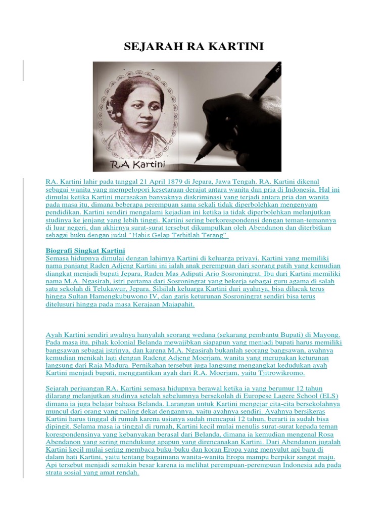 Biografi ra kartini menceritakan kartini dalam memperjuangkan emansipasi wanita di zaman penjajahan belanda lewat bukunya habis gelap terbitlah terang. Adipati ario singgih djojo adhiningrat. Ia merupakan putri dari seperti diketahui dalam sejarah, kartini meninggal pasca melahirkan, tepatnya 4 hari setelah. Kartini adalah pahlawan nasional yang sangat berjasa dalam sejarah bangsa indonesia khususnya kaum wanita. Siapa yang tak kenal dengan ra #kartini? Meskipun kartini tidak 100% darah bangsawan, namun ia tetap tinggal bersama ayahnya dan menjadi golongan ningrat. Akhirnya kartini mentransenden dari sekadar partikel sejarah menjadi mitos, ketika konteks telah kabur, ketika kemungkinan kekurangan menjadi terabaikan atau cenderung tidak diperhitungkan. Kartini lahir pada tanggal 21 april 1879 di jepara, jawa tengah. Hal ini dimulai ketika kartini merasakan banyaknya diskriminasi yang terjadi antara pria. Berikut adalah sekilas sejarah tentang r.a kartini : Sifat serba ingin tahu ra kartini inilah yang mrnjadikan orang tuanya semakin memperhatikan perkembangan jiwanya. Raden adjeng kartini adalah seseorang dari kalangan priyayi atau kelas bangsawan jawa, putri raden mas sosroningrat. Ia pun terpaksa tinggal dirumah karena larangan dari ayahnya.